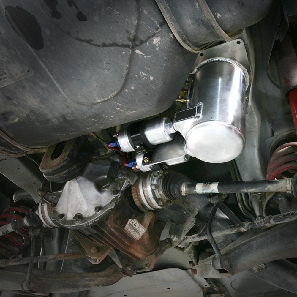 - Sedan surge tank designed to be mounted under the rear of the car in front of the factory tank. Mounting plate precisely shaped to the match the contours of the chassis rail to allow safe and secure location mounting.