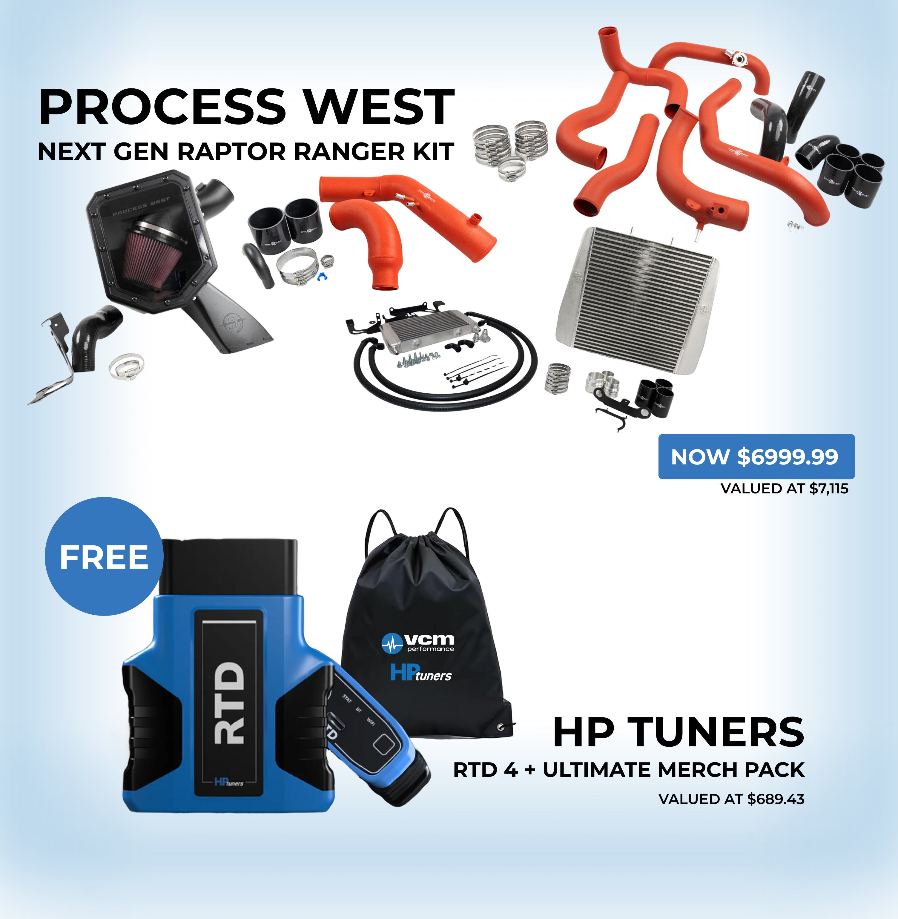 Valued at $7,804.43 RRP get the Full Process West Raptor Ranger Kit, RTD4 and the exclusive VCM Performance & HP Tuners Merch Pack all for $6999.99