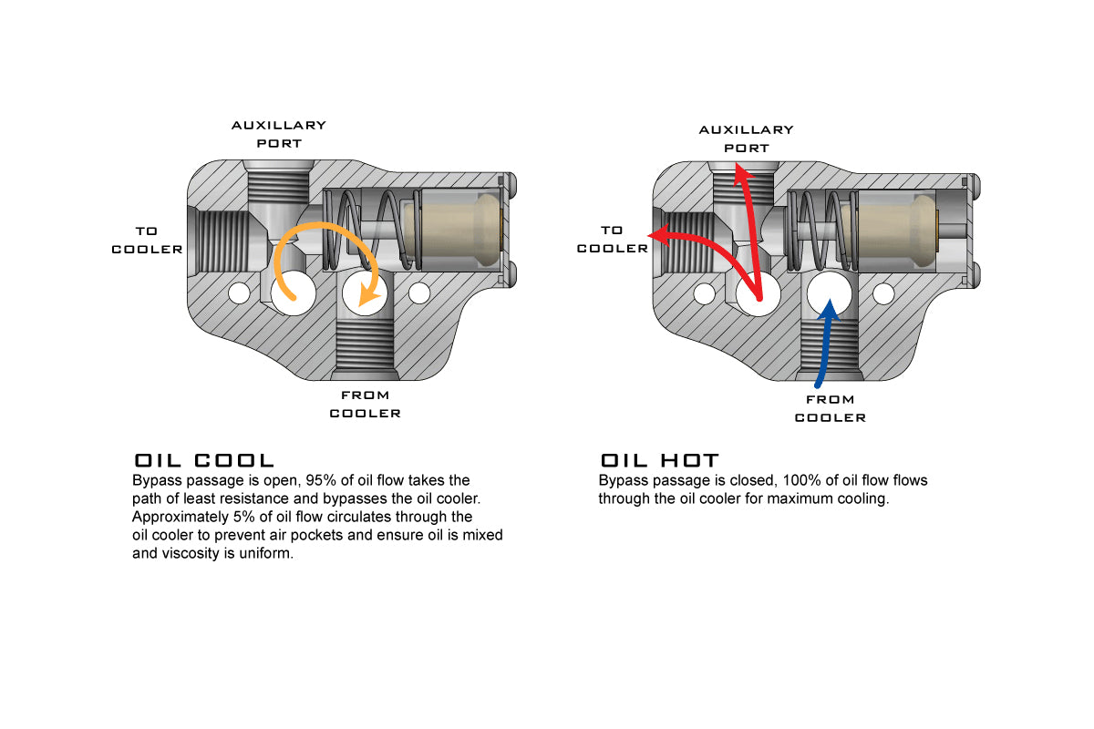 Oil coolers help prevent the oil from getting too hot, but are also prone to lowering oil temperatures too much, especially in colder weather or during highway driving. This unit's built-in thermostat helps protect the engine by speeding up warm-up time and maintaining oil temperatures at optimal levels. The thermostat maintains a minimum oil temperature of 180°F (82°C) +/- 5°F in most conditions.