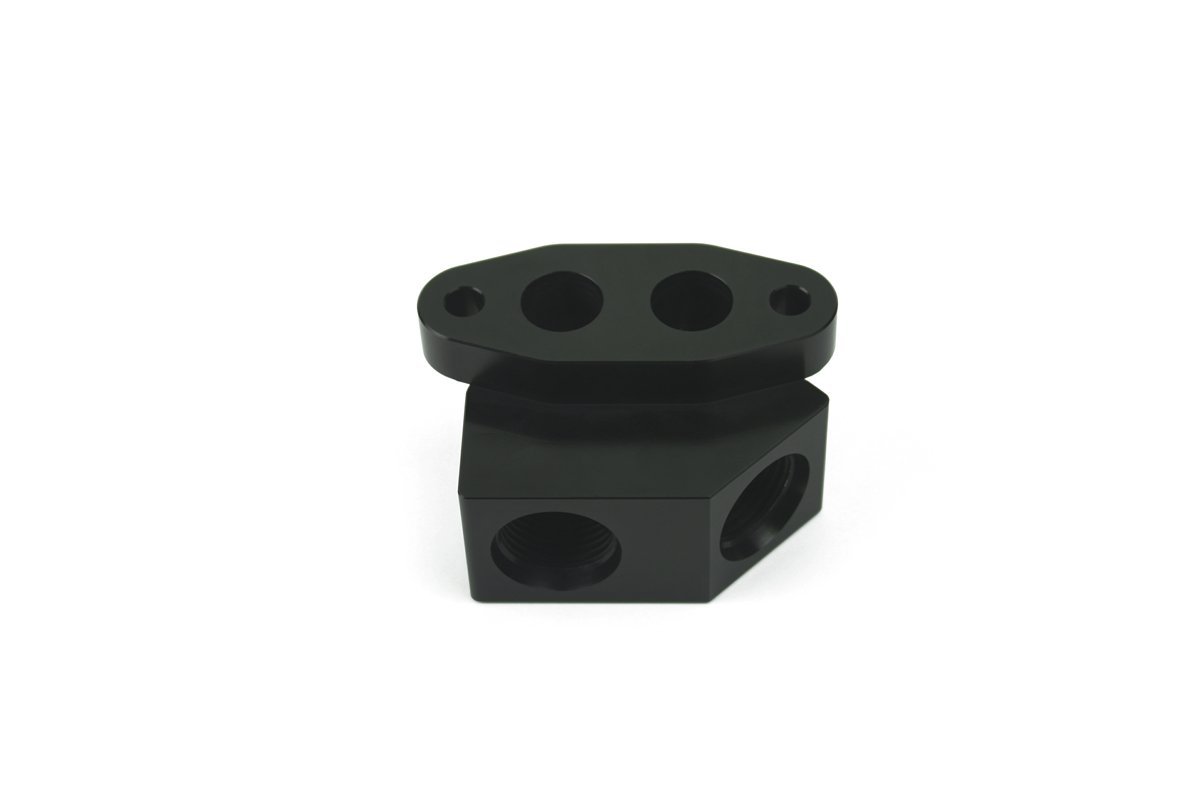 The adapter features two 1/8" NPT ports for oil pressure and temperature sensors, or for a turbo oil supply line. It is machined from 6061-T6 billet aluminium and is anodized for durability. Features standard female -08AN O-ring boss threads for optional anodized adapter fittings in your choice of -08AN, -10AN or -12AN lines.