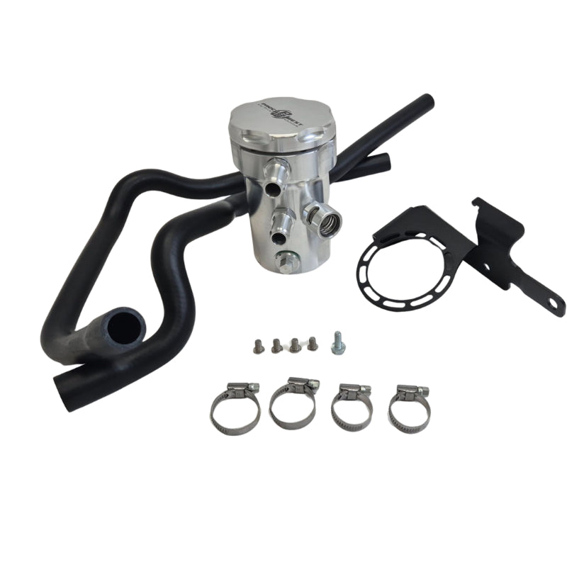 Comes as a complete bolt on kit you. You will receive the billet aluminium catch can with internal filtration system, a precision bracket to bolt into your engine bay, moulded hoses for 'plug and play' perfect fitment, along with the required clamps and mounting hardware. (Instruction manual included).