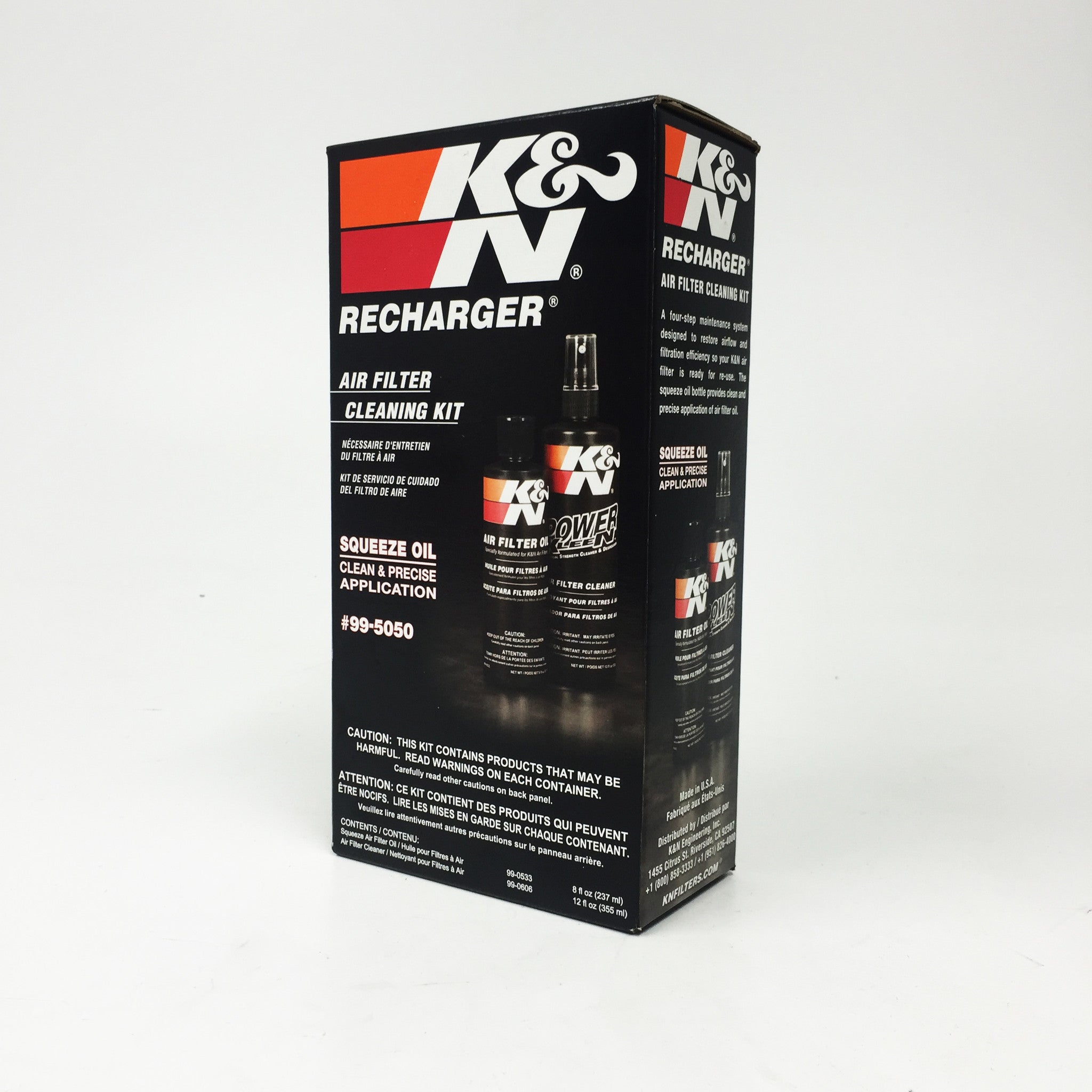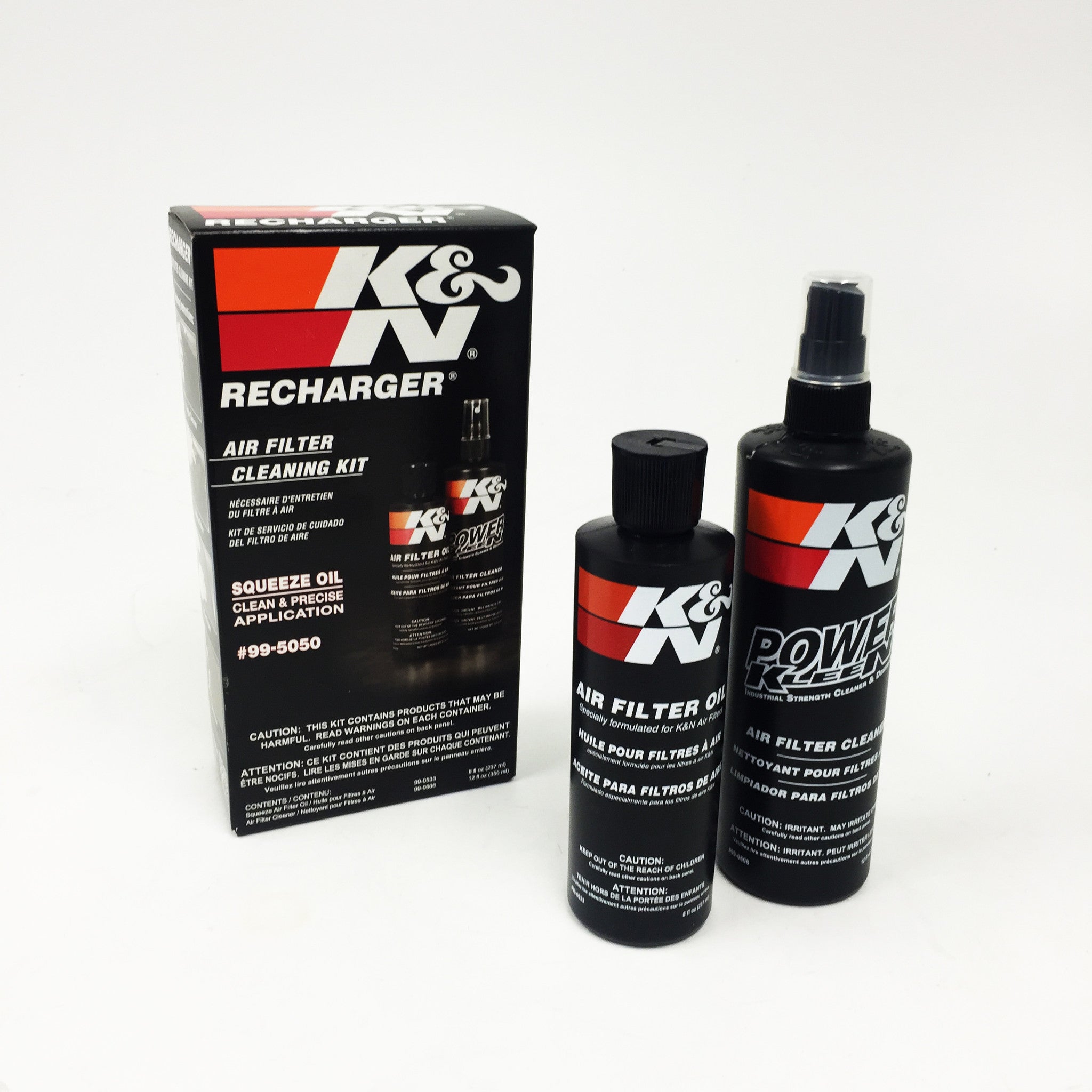 K&N Recharger Kit 99-5050 is designed for cleaning your K&N oiled cotton air filter when it is time to be serviced. The kit comes with K&N Power Kleen air filter cleaner and K&N air filter oil. 99-5050 will restore air flow efficiency and will bring your K&N oiled cotton air filter to like new condition. K&N Power Kleen works to dissolve the dirt build up and old filter oil, then it can be washed away with water. After the air filter fully dries re-oil your air filter then reinstall it. This Recharger Kit comes with an 8 ounce squeeze bottle of oil and a 12 ounce K&N pump bottle of Power Kleen air filter cleaner.