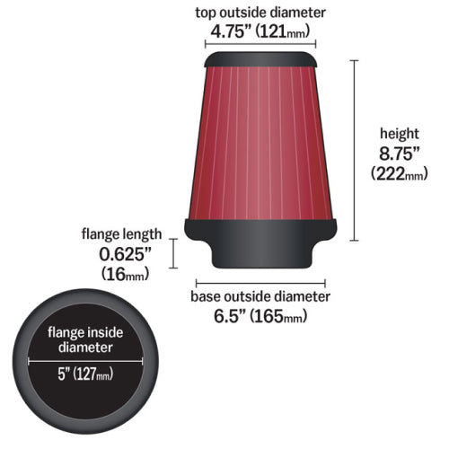 All filters are constructed with ultra-strong molded pliable rubber flanges which absorb vibration and allow for secure attachment and can also be stretched for up to 1/16 of an inch (1.5mm) to fit in-between sizes. K&N universal air filters are washable and reusable.